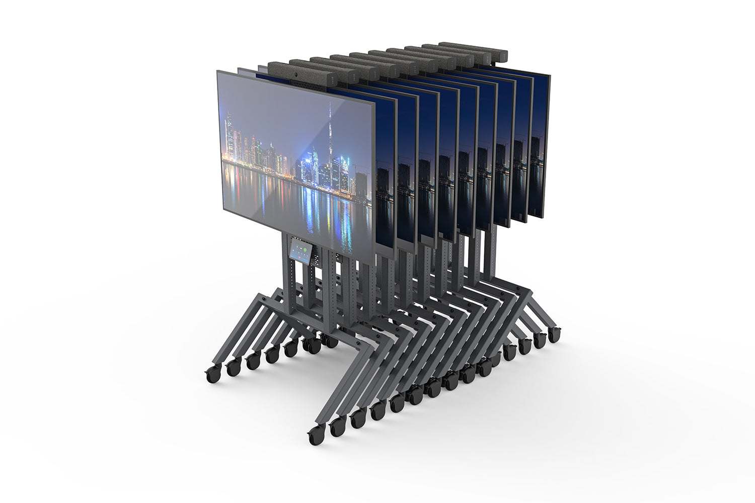 Carts waste floor space, eh? Not this one. Heckler AV Cart's slick-looking form follows one important function - to save you floor space. Each Heckler AV Cart can be configured to nest within inches of the next. Upgrading your legacy carts to Heckler AV Carts could save you thousands of square feet of floor space. This feature not only saves space during storage but also during mass deployment. Dozens of carts can be erected and configured in one small room, then simply rolled to their final destination. Finally, you can achieve mass deployment without mass disruption.