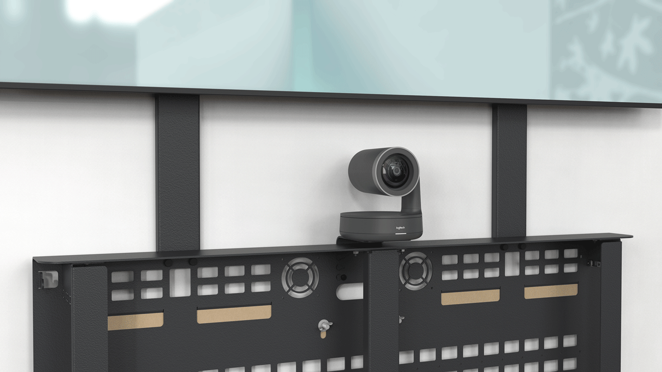 Heckler AV Credenza includes three different camera-mounting brackets to securely position today's best PTZ cameras, video conferencing cameras, and appliances like Logitech Rally Bar.