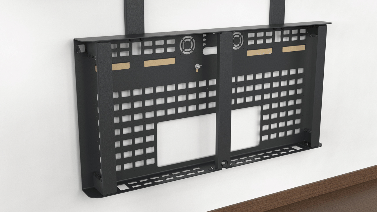 Heckler AV Credenza disperses heat passively. With its body spaced away from your wall, and its open-grid rear surface, cool room air enters through the bottom and exits out the back. If your builds benefit from additional warm air exhausting, you can mount a pair of your favorite 80mm fans.