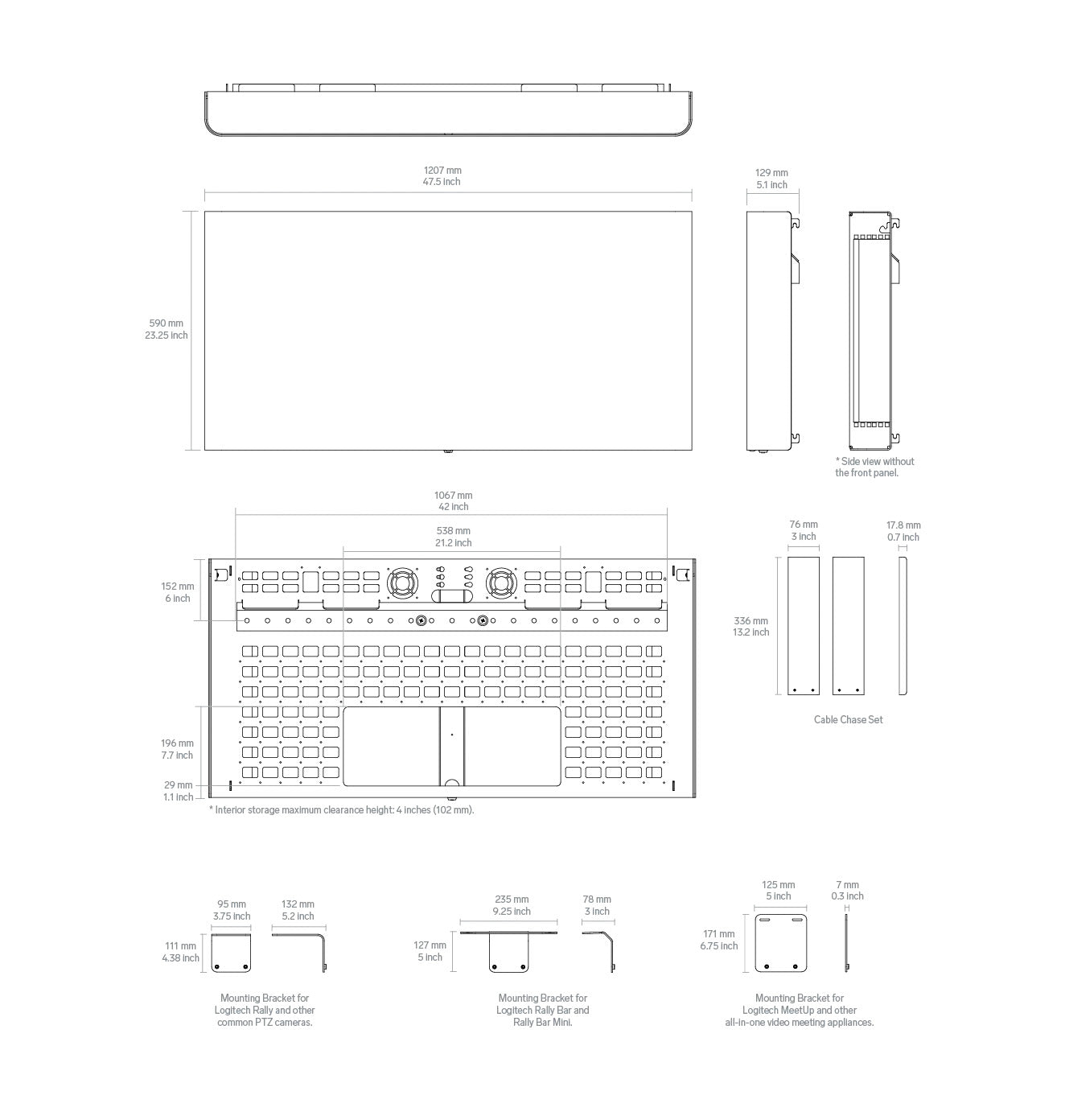 Heckler AV Credenza includes three different camera-mounting brackets to securely position today's best PTZ cameras, video conferencing cameras, and appliances like Logitech Rally Bar.