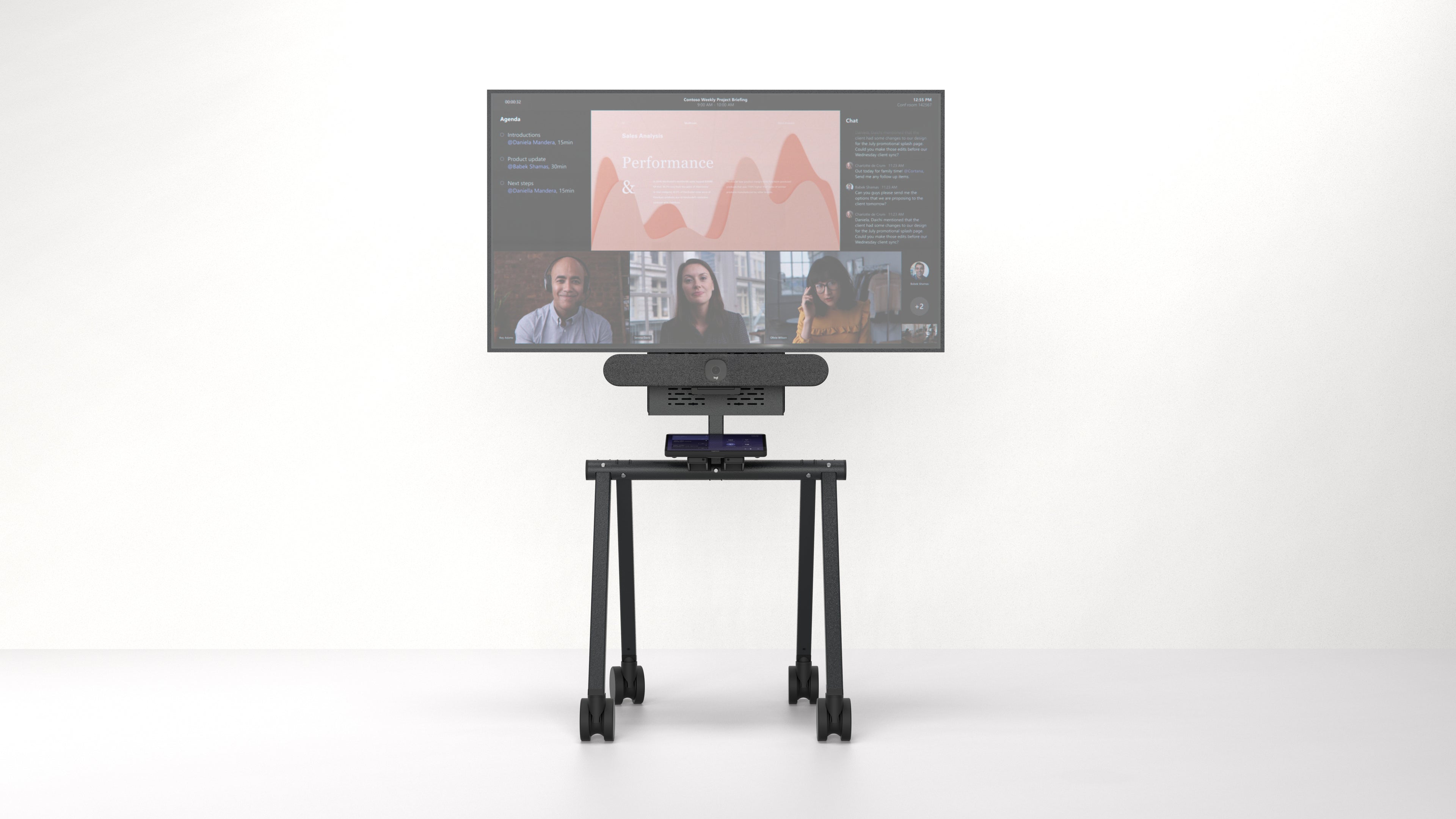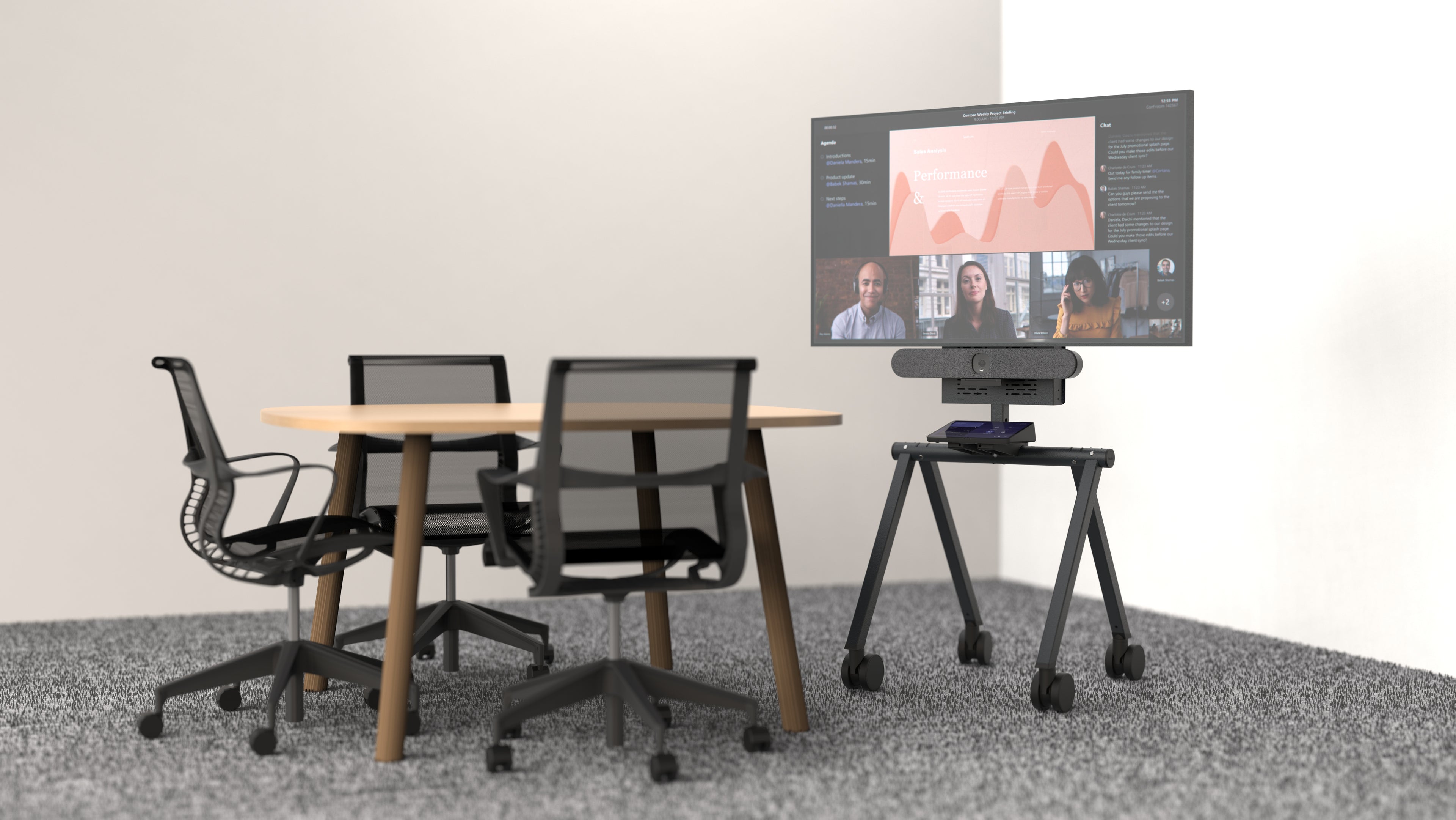 Roll the stand into place. Remove a single chair from the table. The compact footprint fits any room layout — no renovations, no reconfigurations. A fully equipped Microsoft Teams Room in minutes."