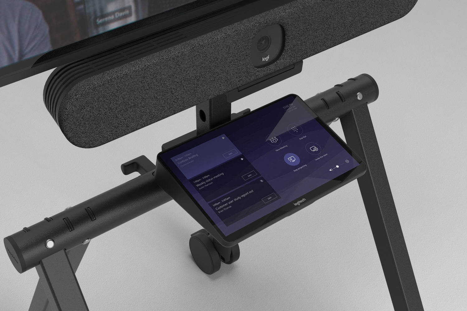 The Grab & Go Shelf docks Logitech Tap or Tap IP to the stand for a clean, all-in-one setup. Undock and place on the meeting table when needed. A cord wrap near the shelf keeps the CAT cable tidy for quick transitions between docked and tabletop use.