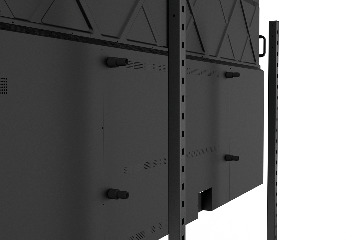 No tools required. No wasted screws and spacers. Fasten our patent-pending display anchors to your display by hand, hang your display to our columns, then snap in the cable managers to fix the anchors. You're done. M8 mounting hardware included. M6 hardware sold separately.
