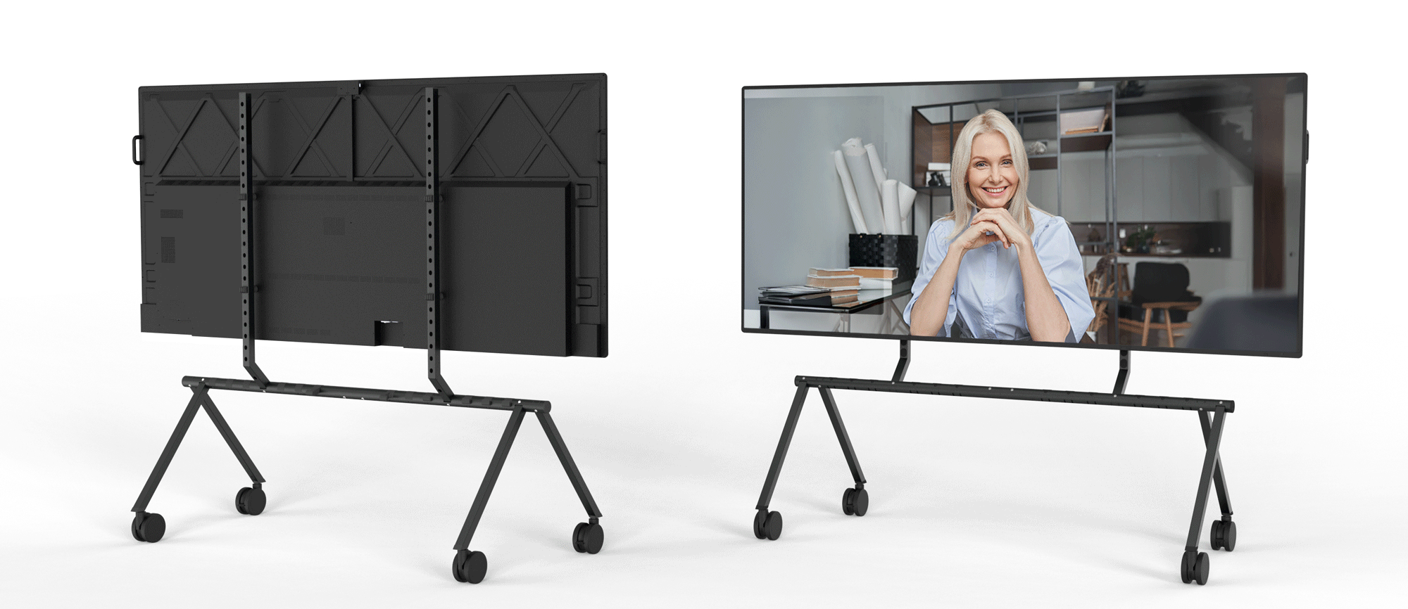 When not in use, multiple stands can be stacked together more compact than any other rolling stand - freeing up valuable floor space. This space-saving capability makes it easy to store dozens of stands in a minimal footprint. Great for event venues, all-hands meetings, and any organization that wants to share their largest displays throughout their workspace.